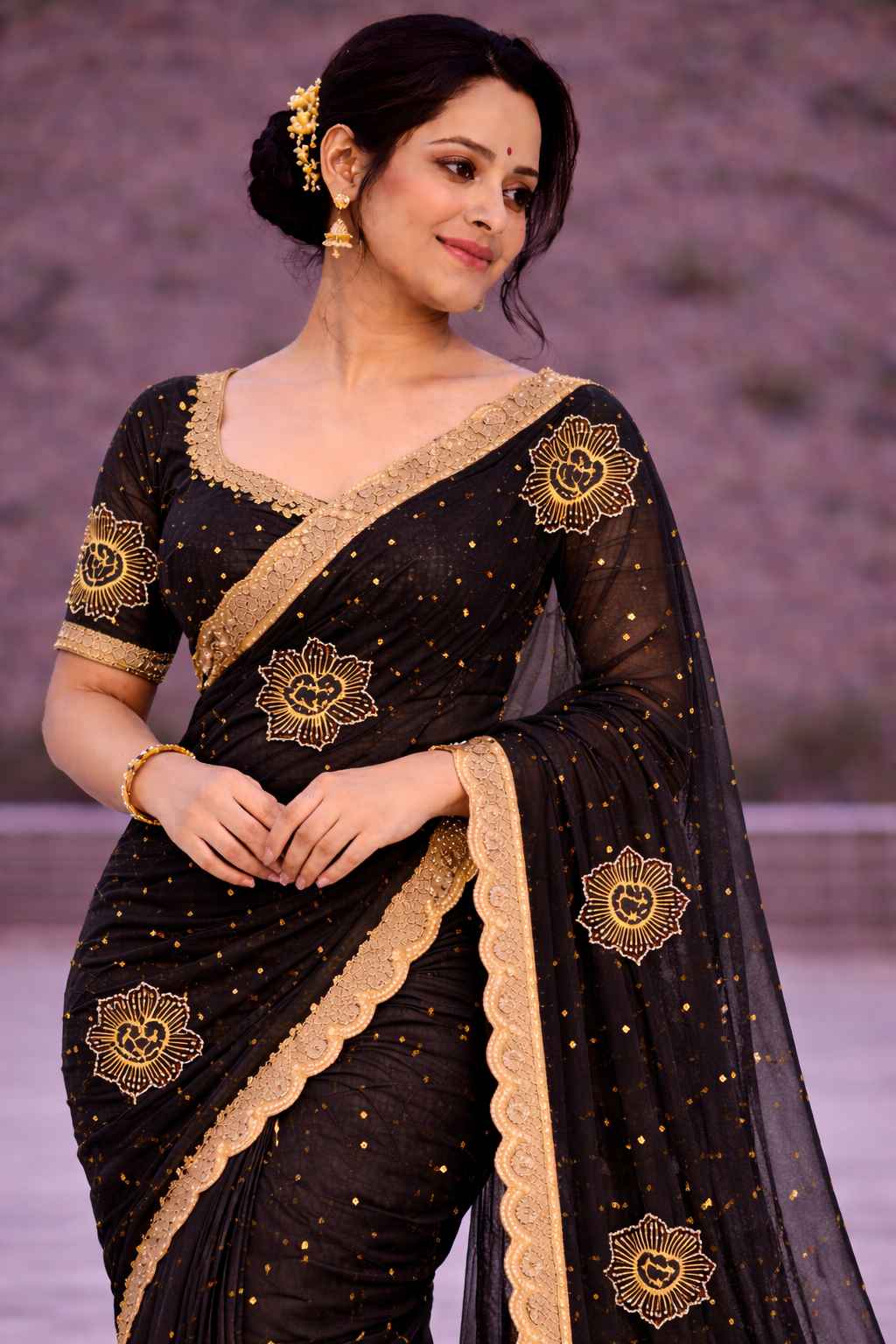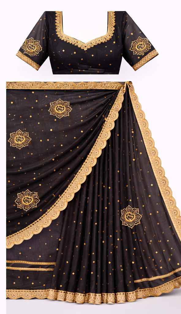 Black Net Saree with Golden Lotus Embroidery