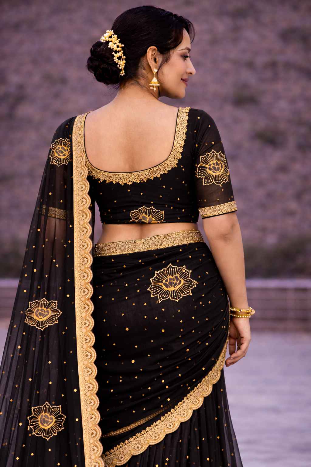 The saree is finished with a scalloped golden lace border that adds a premium touch to the overall drape. Paired with a matching black blouse featuring coordinated embroidery and a stylish deep back neckline, this saree looks equally stunning from the front and back.