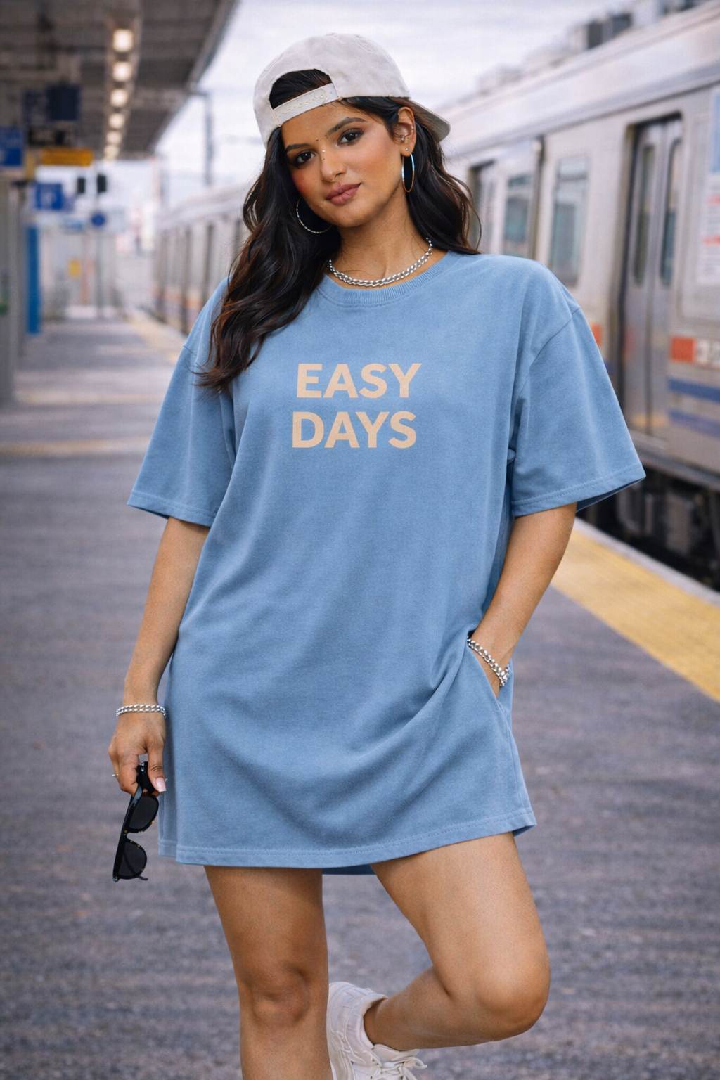 Stay fresh and relaxed with this Ice Blue Oversized T-Shirt Dress, made for Indian Gen Z women who love clean aesthetics and chill vibes. The soft light-blue shade gives a cool, airy look, while the “Easy Days” front text keeps the outfit minimal and modern.