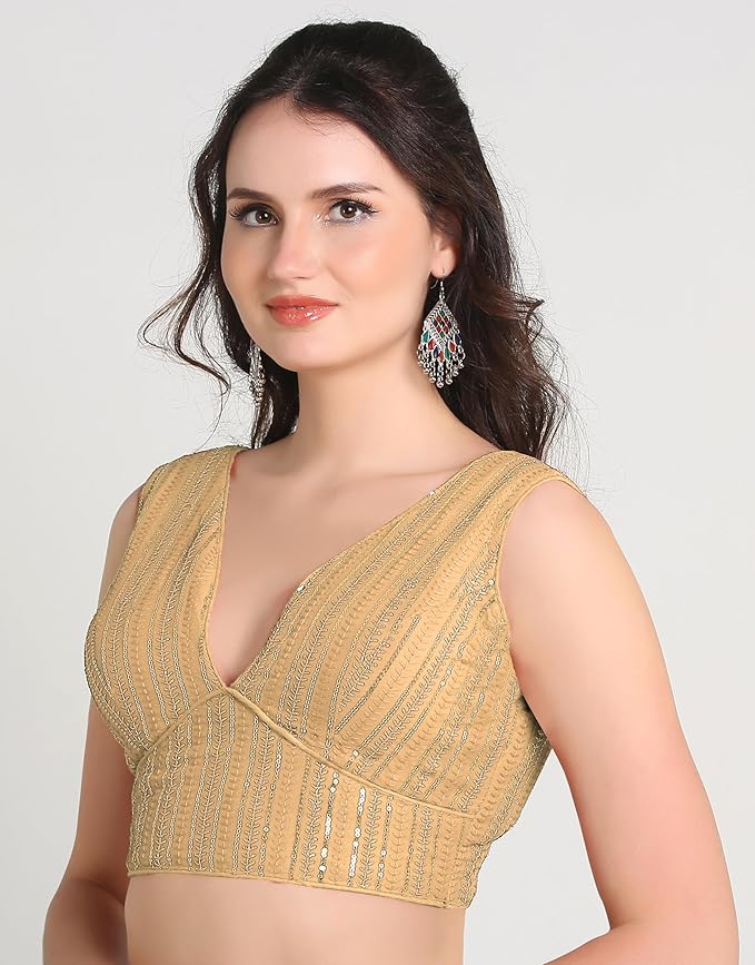 - This solid yet stylish sleeveless blouse for women, readymade; Fabric: Georgette, Work-Matching dhaga Embroidery work with zari sequence work is extremely versatile with Sabyasachi pattern and sweetheart neckline
