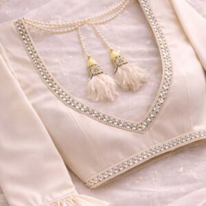 Cream Satin Pearl & Mirror Work Deep U Back Blouse